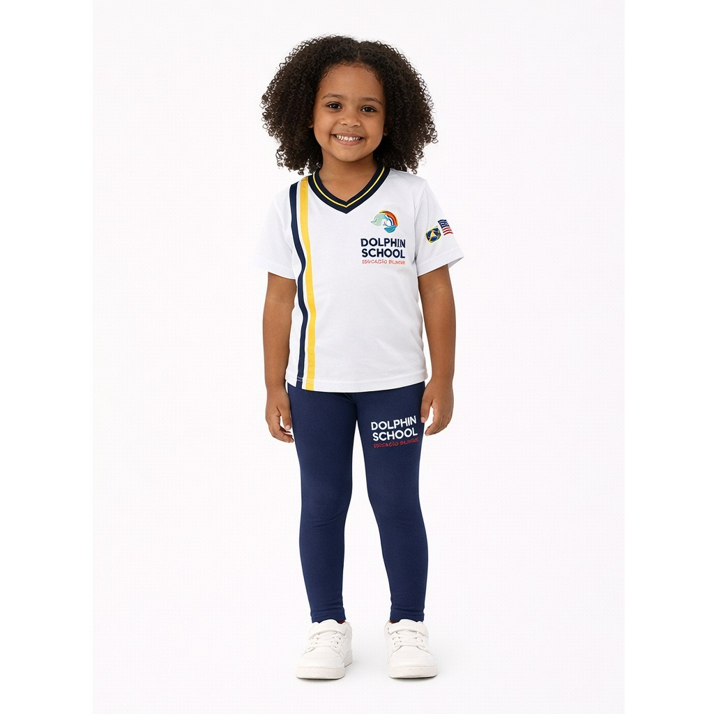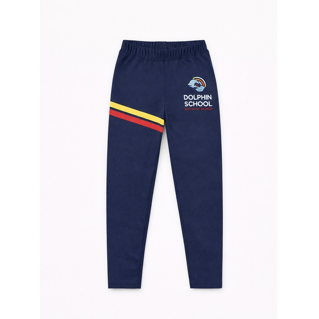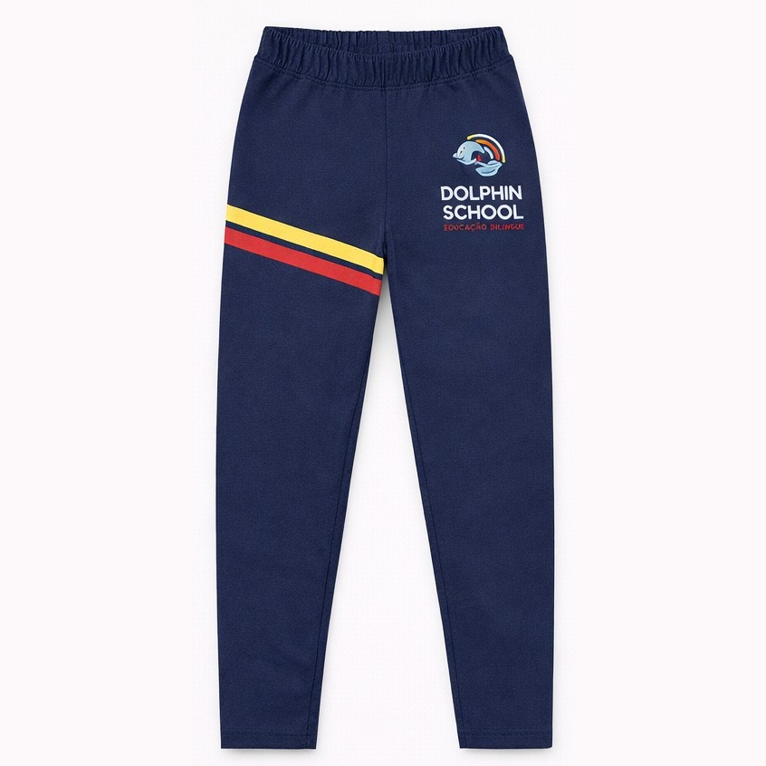Em azul-marinho com listras diagonais em amarelo e vermelho que percorrem a lateral da perna, a peça segue a identidade visual oficial da escola. O cós elástico proporciona ajuste confortável durante todo o dia. No lateral, bordado oficial com o nome e logotipo da Dolphin School – Educação Bilíngue.